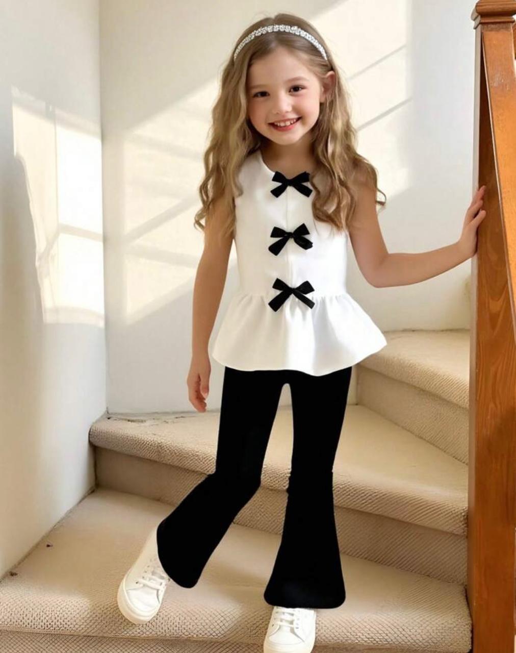 Chic and comfortable, this 2-piece set for girls features a sleeveless top with a 3D bow and ruffle details, paired with slim-fit flare pants. Perfect for casual wear, urban outings, or elegant occasions, it’s a stylish choice for summer and beyond.