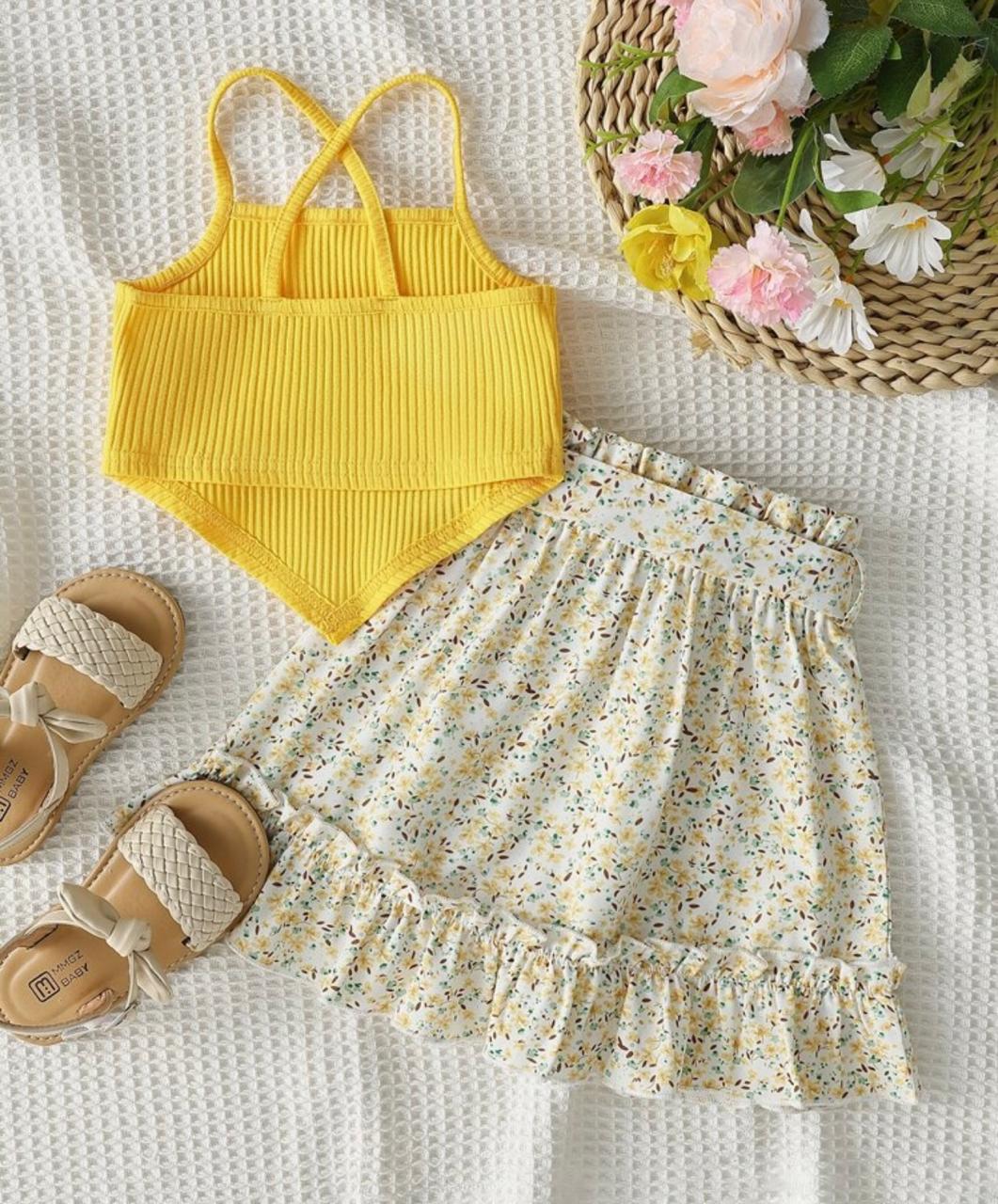 Sweet and stylish, the Vintaside Baby Girl Outfit features a hanky hem cami top paired with a ditsy floral paperbag waist belted skirt. Lightweight and comfortable, this adorable set is perfect for spring and summer days, family outings, or casual wear. A cute and trendy choice for little girls.