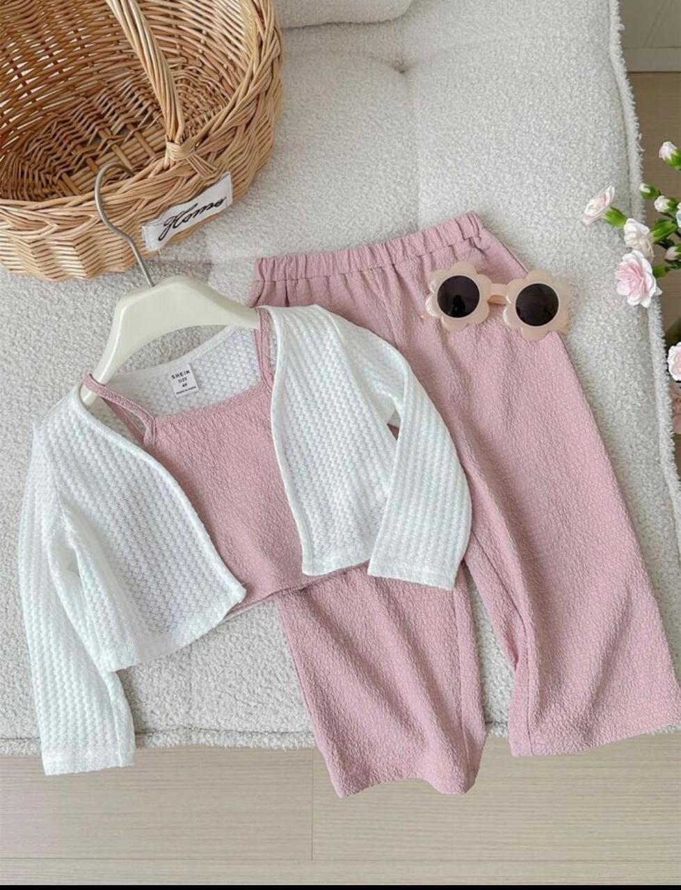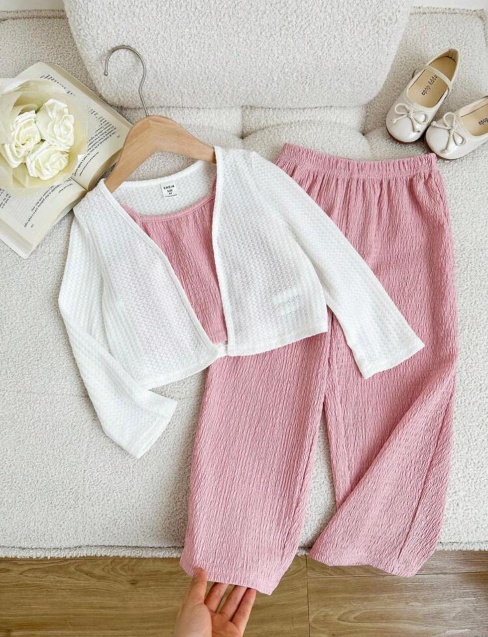 Upgrade your little girl’s wardrobe with this LMoss Kids 3-Piece Set, featuring a soft solid-color cardigan, matching casual pants, and a comfy top. Designed with a loose fit for all-day comfort, this stylish co-ord set is perfect for spring outings, playdates, and casual wear. Versatile and chic, it’s a must-have outfit for toddlers and young girls.