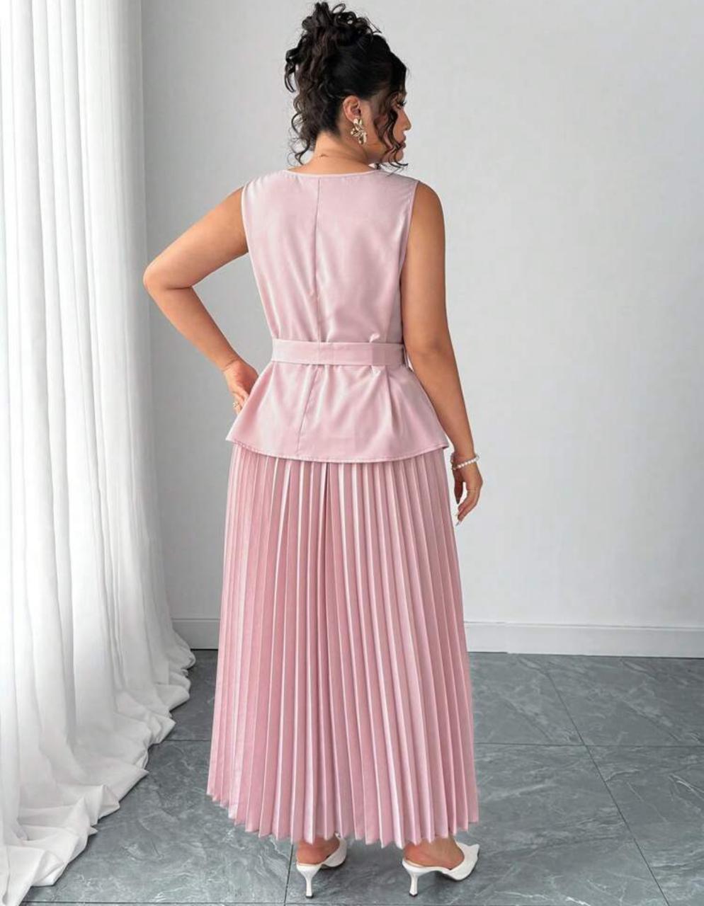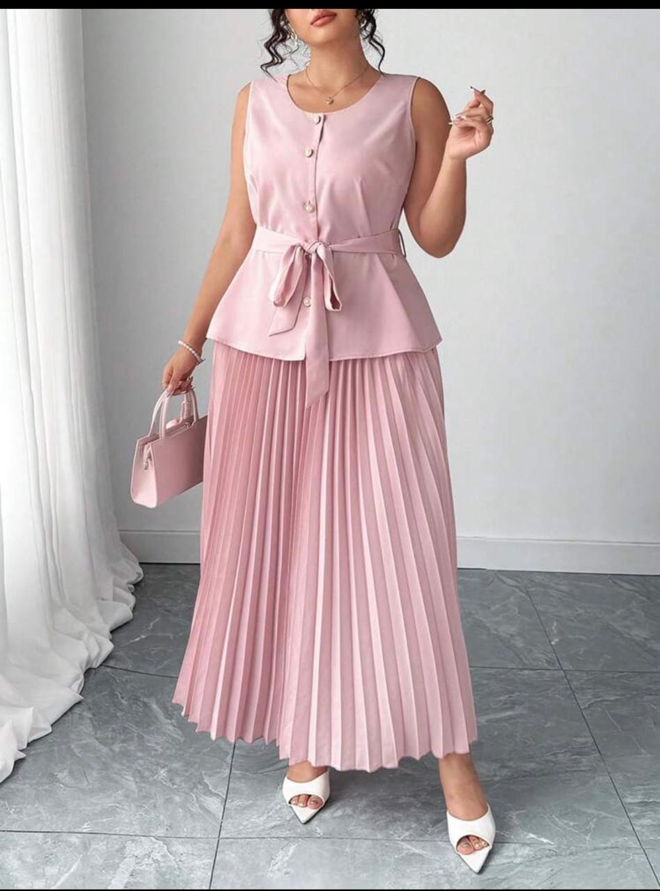Stay effortlessly elegant with the Elenzga plus size women’s 2-piece set, featuring a minimalist solid color sleeveless button-down shirt paired with a pleated A-line skirt. Finished with a chic bow detail, this coordinated outfit is perfect for summer business casual looks, formal events, or as a stylish wedding guest dress alternative. Versatile and timeless, this matching set combines comfort and sophistication—making it a must-have addition to your summer wardrobe.