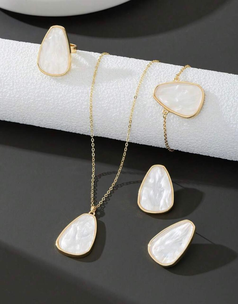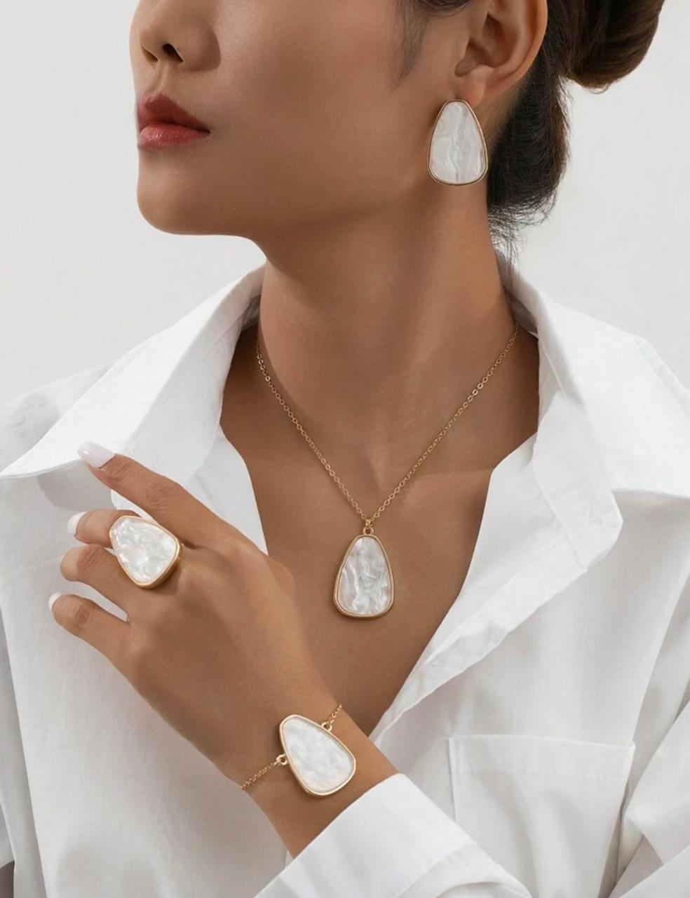 Complete your look with this elegant white jewelry set, featuring an asymmetrical geometric pendant necklace, matching bracelet, earrings, and ring. Perfect for parties, weddings, formal events, or gifting, this set adds a modern and sophisticated touch to any outfit.