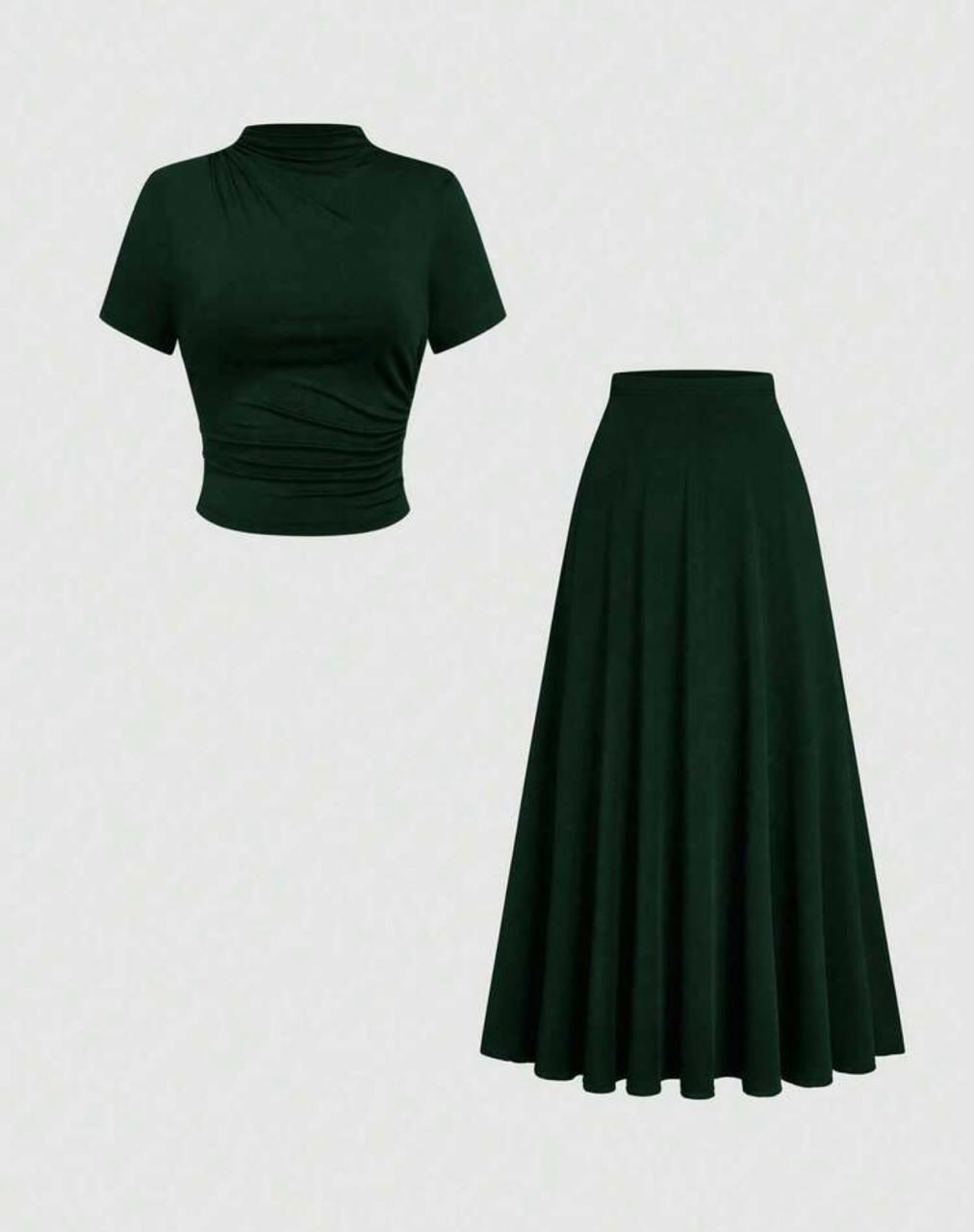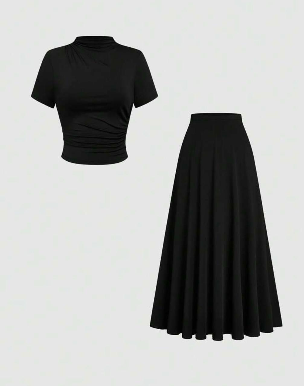 The Clasi 2-piece women’s outfit is a stylish and versatile choice for spring and summer. This plus size set features a ruched knit short sleeve top paired with a flowy long skirt for a chic yet comfortable look. Perfect for commuting, casual outings, or office wear, it transitions effortlessly from day to evening. Pair with sandals for relaxed style or heels for an elegant business casual outfit.